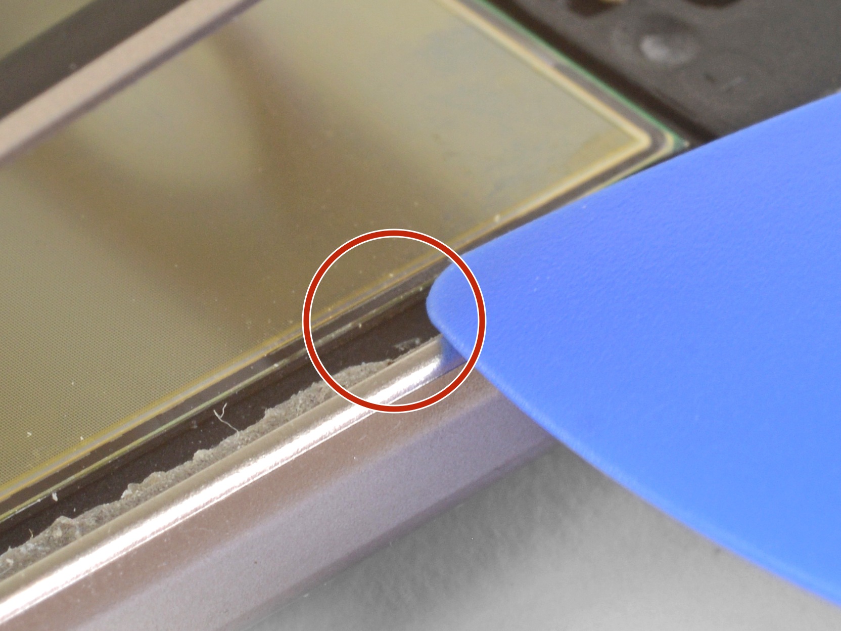 Use an opening tool to carefully scrape the adhesive off the capacitive button surfaces.